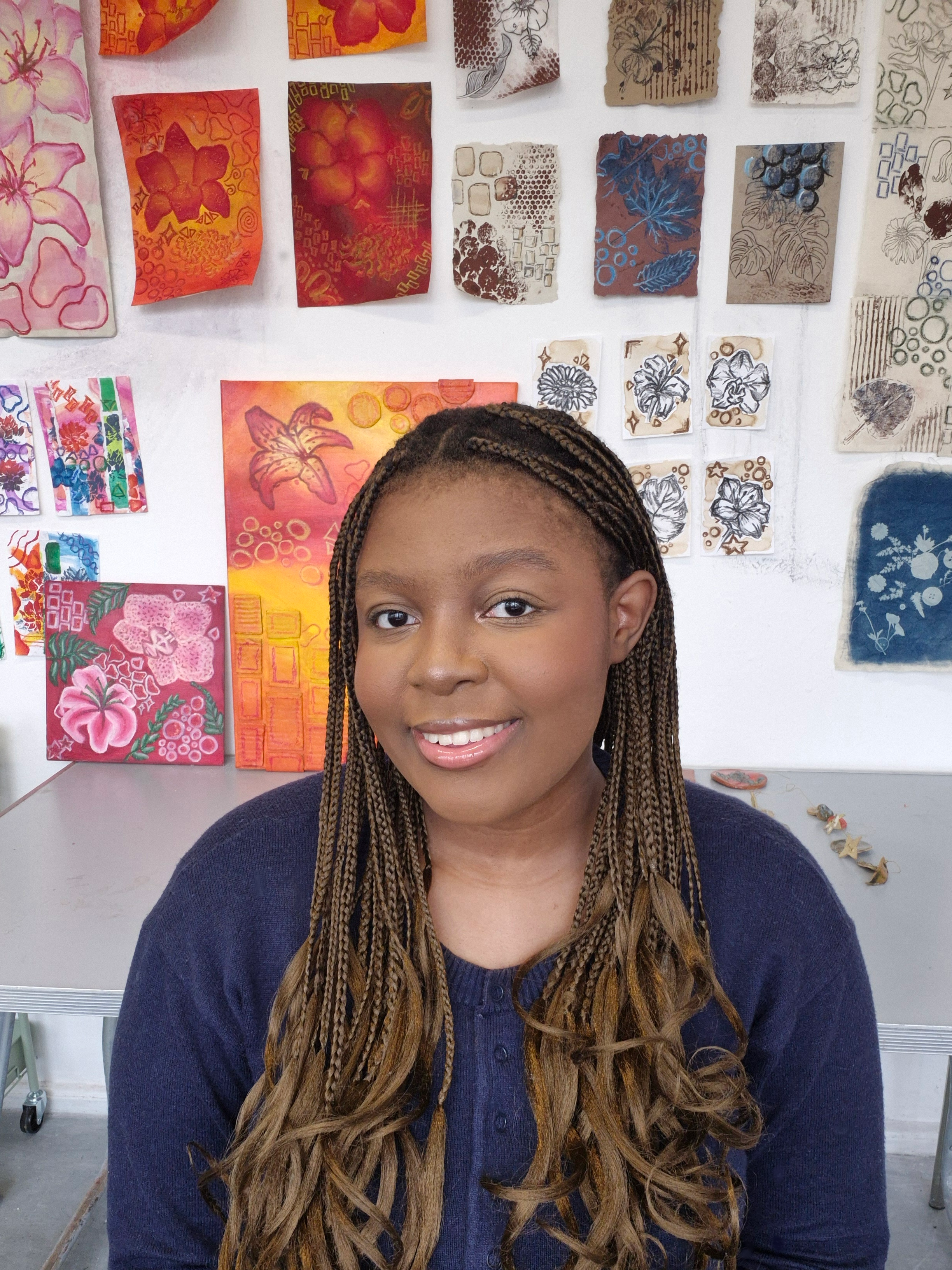 Michelle's practice centres on working closely with natural forms and materials, exploring the quiet details found in leaves, flowers, and organic textures. She's drawn to printmaking and mixed media because of their tactile and experimental qualities, allowing her to build layered surfaces through processes such as linoprint, cyanotype, monoprint, and collage.
